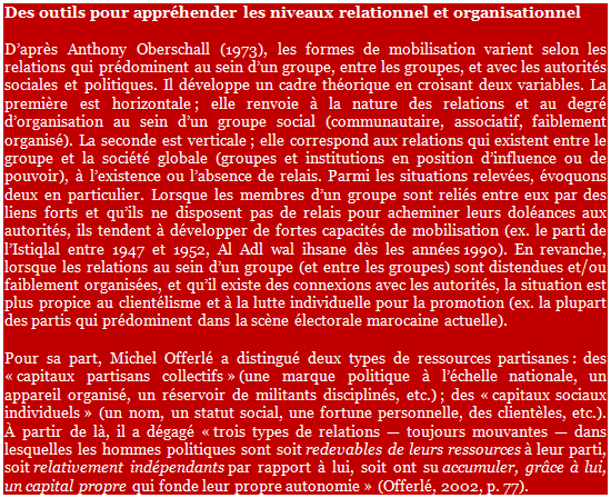 Depuis que la monarchie s’est lancée dans le « processus démocratique », l’adhésion ou le rejet des politiques de compromis a constitué la principale ligne de partage au sein de la scène politique et à l’intérieur des partis politiques eux-mêmes. Cette tendance s’est exacerbée avec la formation du gouvernement d’« alternance » en 1998 et d’importants réaménagements ont affecté l’autoritarisme monarchique, les arènes partisanes, électorales et protestataires. Reste à souligner que les choix privilégiés par les acteurs partisans sont irréductibles à des catégories morales (« corrompus », « vendus » versus « incorruptibles », « fidèles »). En effet, leur positionnement à l’égard du régime et leurs stratégies sont conditionnés par un ensemble de facteurs, des plus macrostructurels aux plus microsociologiques. Ici, il s’agit d’attirer l’attention sur les niveaux relationnel et organisationnel : les ressources dont disposent les acteurs, leurs perceptions de leur environnement, des dynamiques en œuvre, leurs appréciations des cartes qu’ils peuvent jouer, des atouts et des handicaps de leurs adversaires, etc.